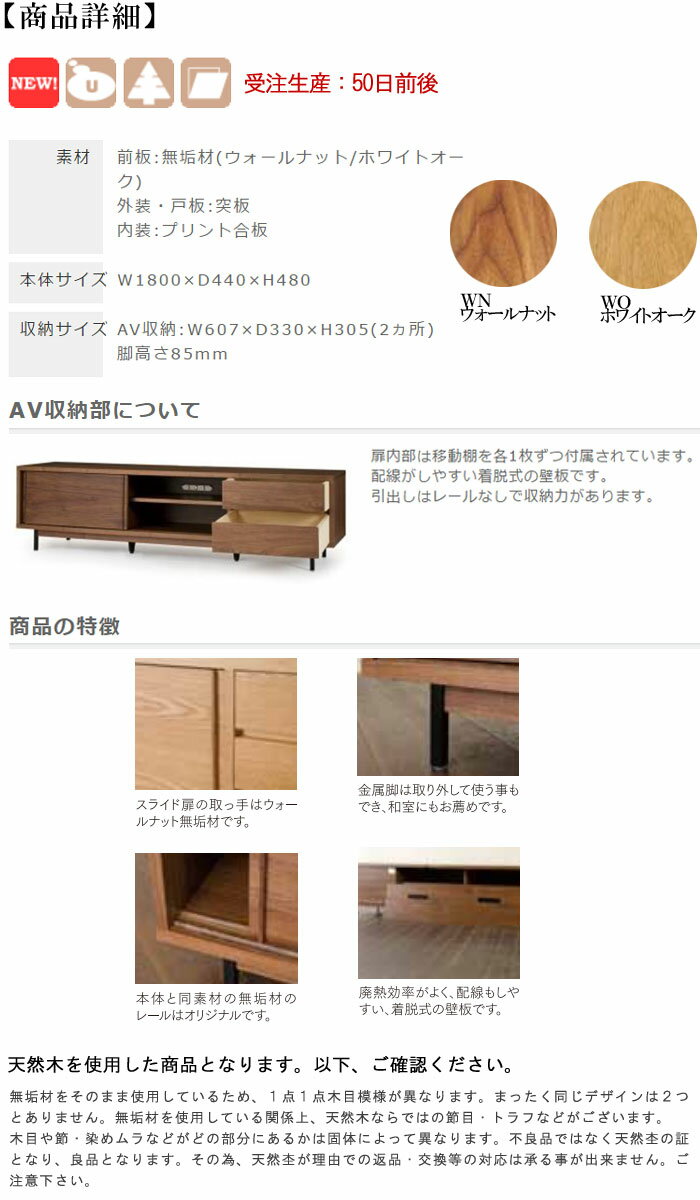 TVボード 幅180cm ウォールナット ホワイトオーク 国産品 日本製 無垢 天然木 引出し テレビボード リビングボード テレビ台 TV台 リビング家具 AV収納 収納 北欧 モダン シンプル スタイリッシュ GOK【PR1】