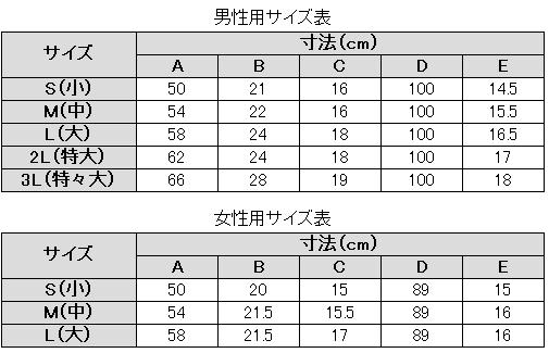 男性用サイズ表 サイズ 寸法(cm) A B C D E S(小) 50 21 16 100 14.5 M(中) 54 22 16 100 15.5 L(大) 58 24 18 100 16.5 2L(特大) 62 24 18 100 17 3L(特々大) 66 28 19 100 18 女性用サイズ表 サイズ 寸法(cm) A B C D E S(小) 50 20 15 89 15 M(中) 54 21.5 15.5 89 16 L(大) 58 21.5 17 89 16 ネット上のサイズ表記をアルファベット表記に統一しております。